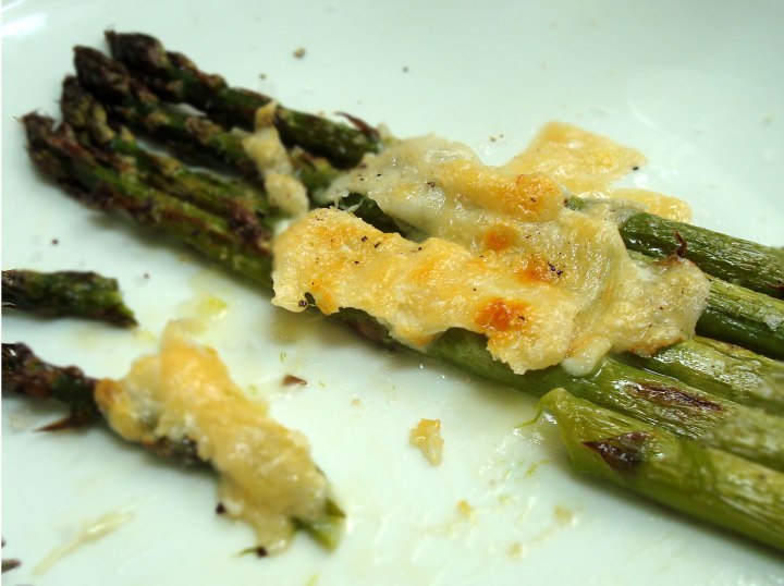 If you haven’t had roasted or grilled asparagus you are in for a treat. Sweet flavours develop rather that the sometimes sock-like taste it can get when boiled. The tanginess of the goats cheese and the caramels of the grilled parmesan form a cheesey sauce for the asparagus. You’ll need bread, ‘cos believe me you will want to lick every bit off the plate.