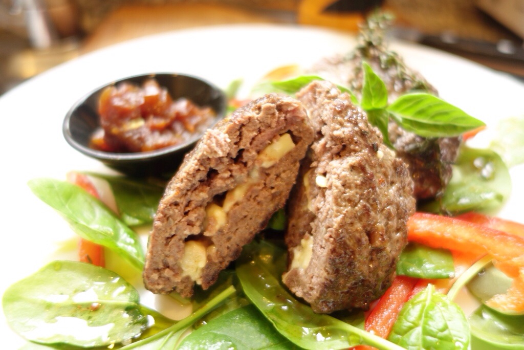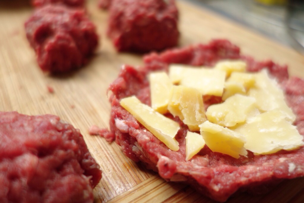 Use a strong, salty cheese that’ll melt such as a tangy blue, cheddar, or gouda. Taleggio’s ooziness would rock this burger. Slice or crumble the cheese, just make sure it is well and truly sealed in its mincey cage.