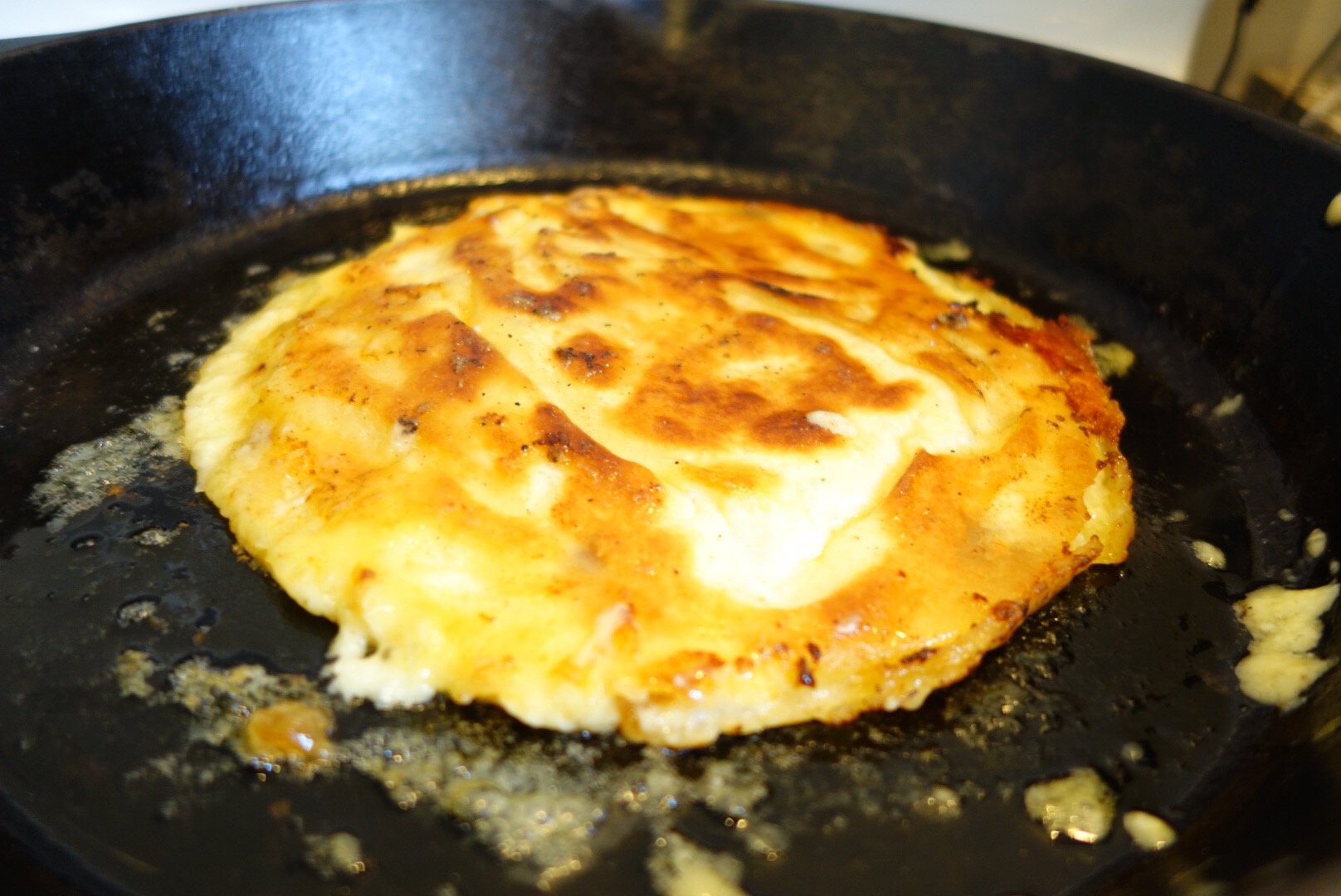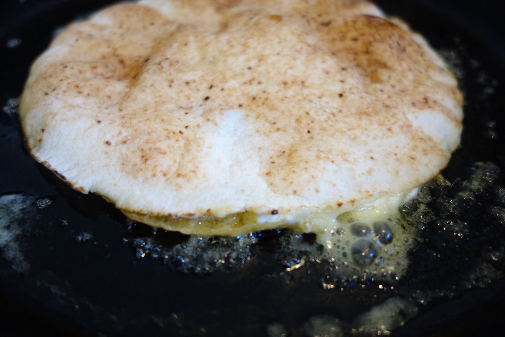 Heat the butter in a skillet over a medium heat. When it bubbles, put in one flatbread, cut side up.