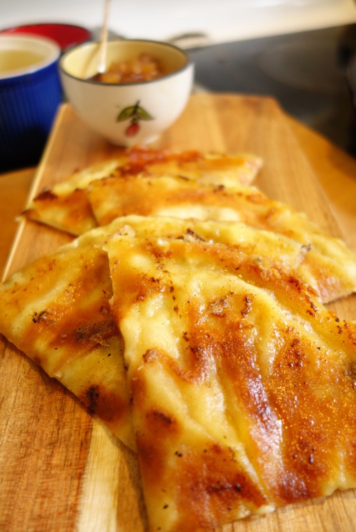 Flatbread grilled sandwich with Fromage Blanc, Cheshire, and Chutney