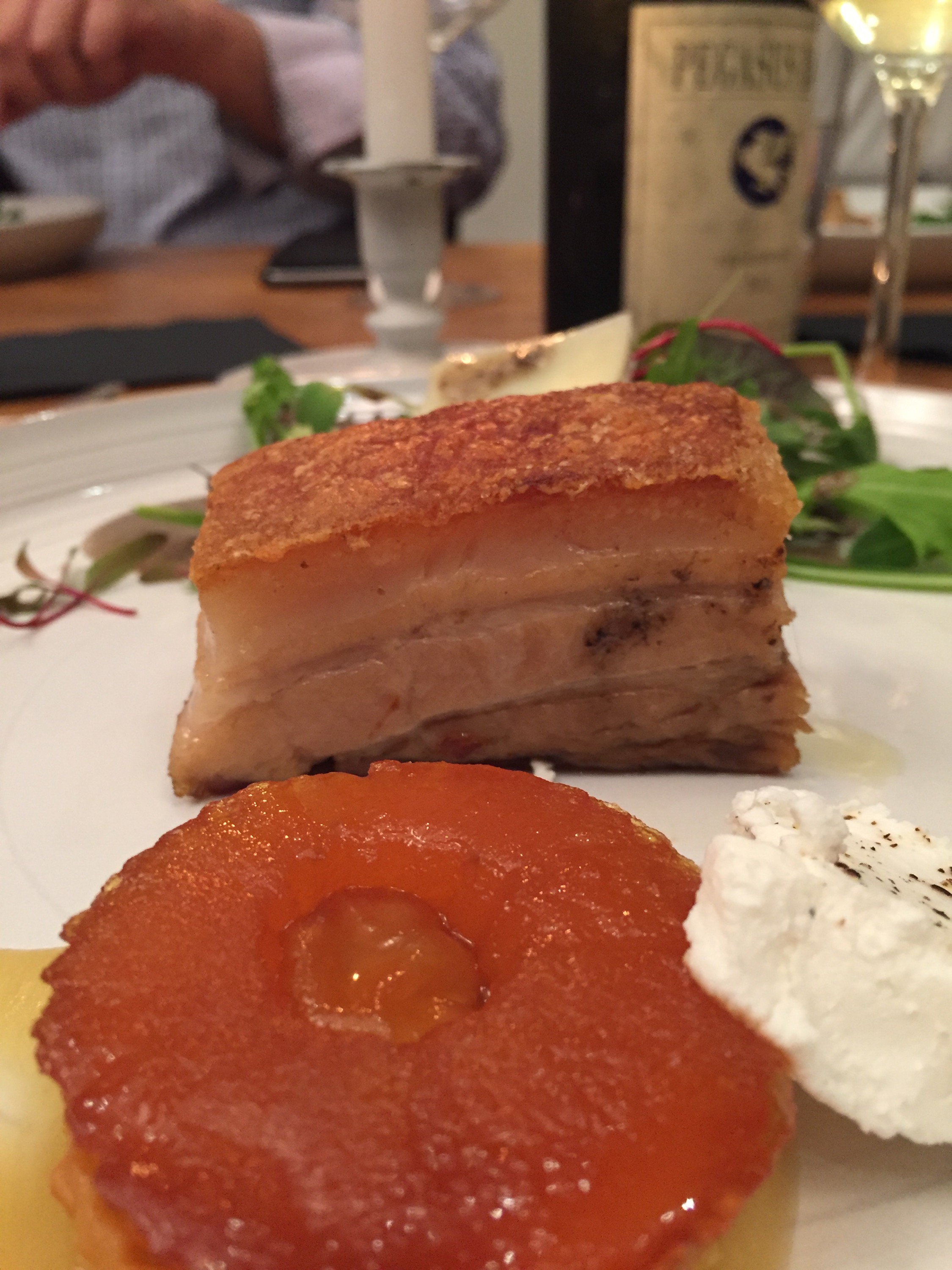 And then a delicious crispy skinned pork belly, apple tart tatin with a truffled salad dressed with goats cheese and pecorino.