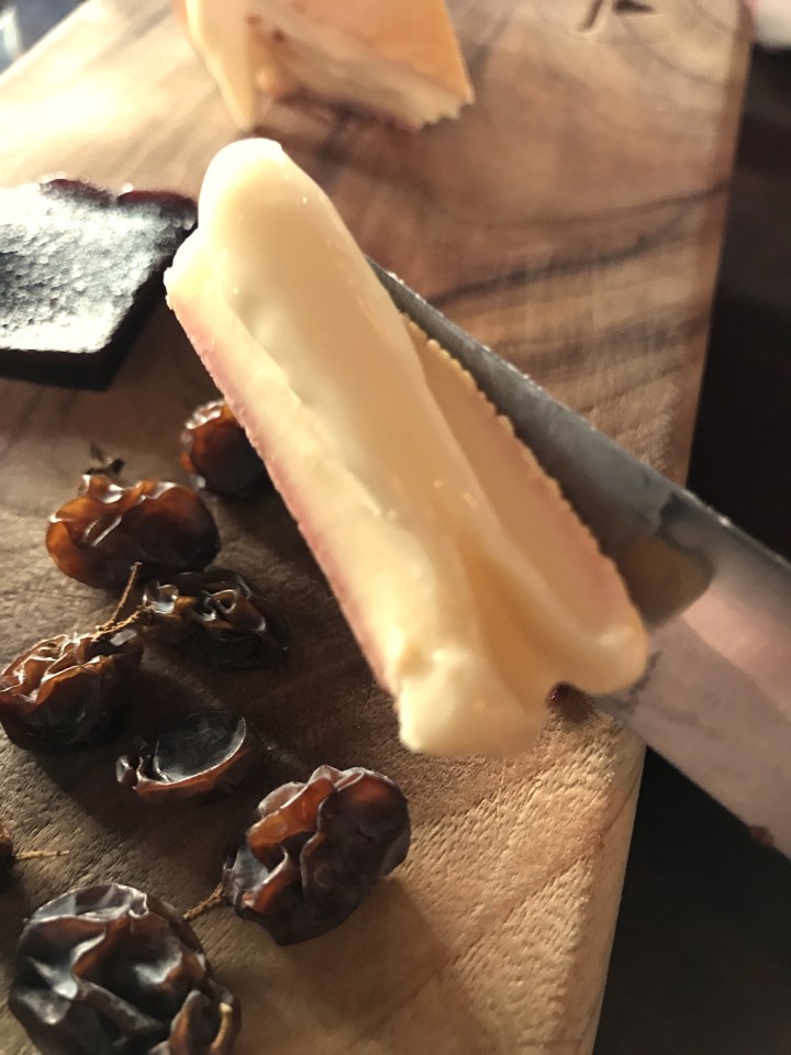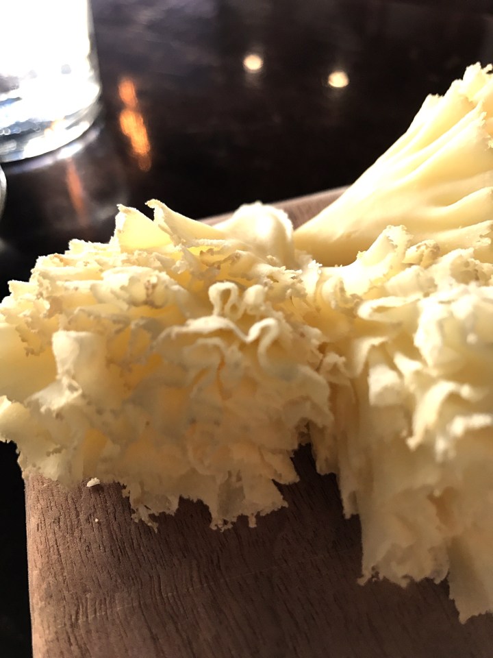 Second favourite on that board was Tete de Moine, a cows milk cheese from Swiss Jura. A special blade, a girolle, is used to shave frilly rosettes. This increases the surface area and so enhances the smell and taste. I love a cheese with its own special tool.